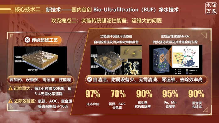 针对村镇供水站净水效能差、污染严重及膜清洗过程带来的药耗高和运维复杂等问题,项目团队自2018年起深耕村镇膜滤净水技术,基于功能层耦合超滤的双重作用,创新无清洗超滤技术,实现净水零药剂、零动力、零运维。实现了饮用水源水中氨氮、AOC、铁锰等多种污染物去除效能的同步提升,及无清洗条件下超滤工艺长期稳定运行,并创建HIT-IOM智慧化管控平台,实现无人值守条件下村镇供水的长期稳定运行。成果填补了低成本、低运维村镇净水领域行业空白,实现规模化推广。目前,团队研发的技术及装备已推广应用至全国14省、37市、368个村镇,陆军/海军部队及柬埔寨等“一带一路”沿线国家,净水效果优异。水泽万家团队扎根中国大地,护航饮水安全,助力乡村振兴。