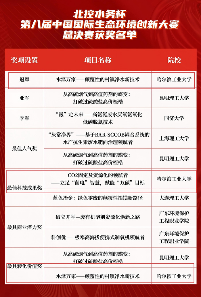 2025年11月22日,北控水务杯第八届中国国际生态环境创新总决赛在云南昆明圆满收官。无码av-无码av线上看 获得创新引领组织奖,无码av “水泽万家——颠覆性的村镇净水新技术”项目荣获冠军、最具转化价值奖,“CO2固定及资源化的领航者——立足‘菌电’智慧,赋能‘双碳’目标”项目斩获最佳科技成果奖。唐小斌、孙志强老师获优秀指导教师奖。