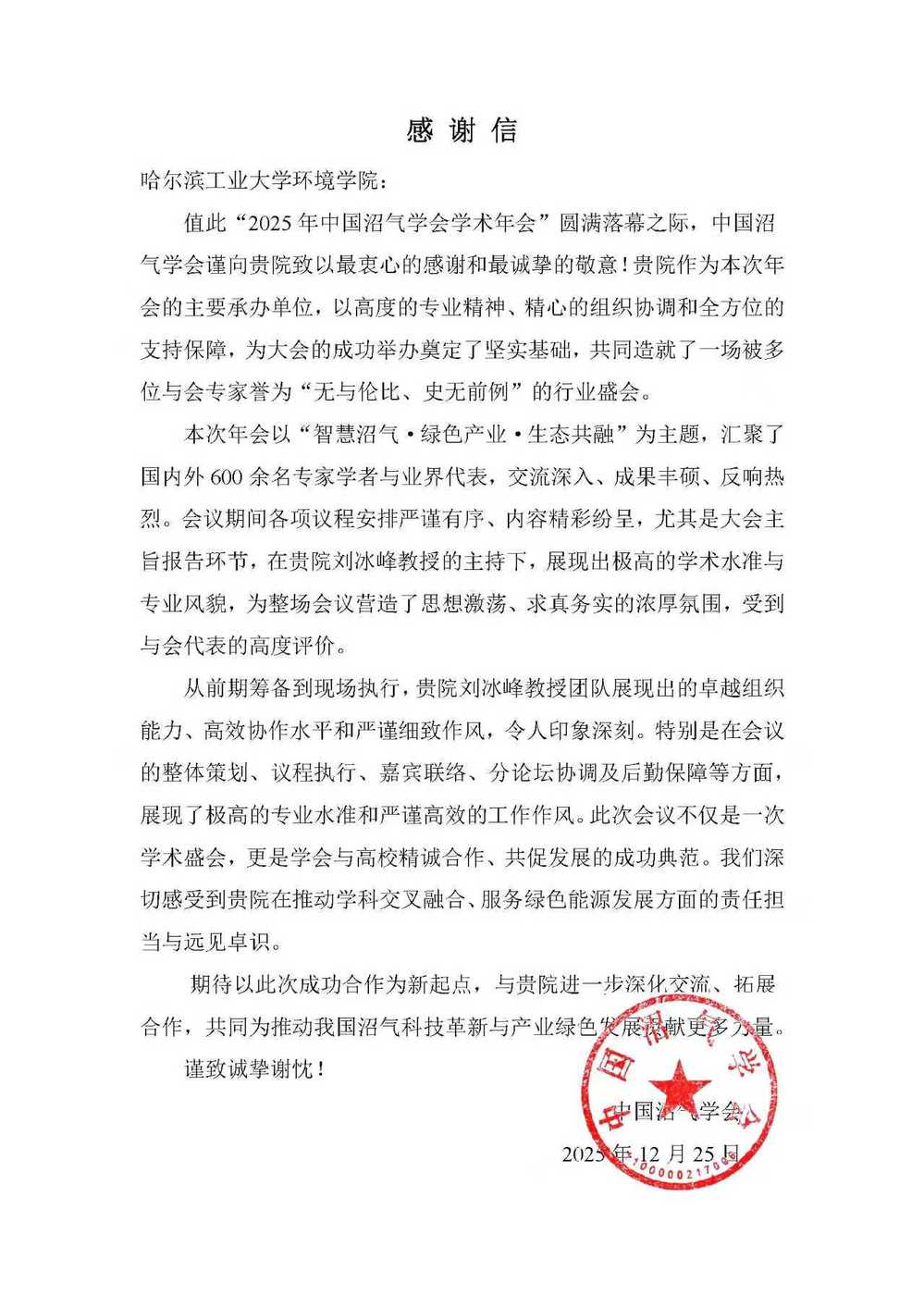 会议结束之际,无码av 无码av 作为承办单位,收到了中国沼气学会的感谢信。未来,无码av将继续支持相关学科发展与产学研合作,积极为国家绿色能源事业贡献力量。